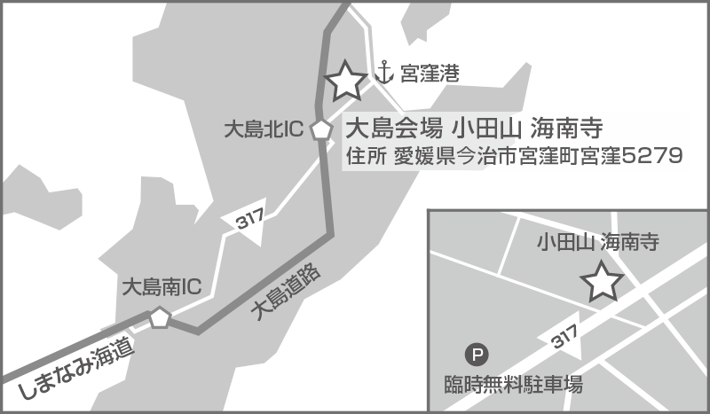 松山中心部より土手内臨時無料駐車場まで約45分 鹿島渡船乗場から市営渡船で3分